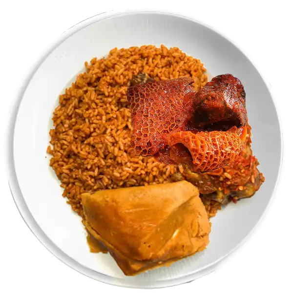 Jollof Rice, Moimoi, and Assorted meats make a quintessential Nigerian meal that’s both